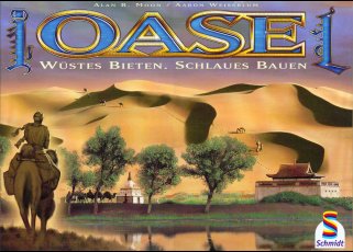 | Titel: Oase Ontwerp: Alan R. Moon / Alan Weissblum Tekeningen: Franz Vohwinkel Producent: Schmidt Spiele Aantal spelers: 3 tot 5 spelers Leeftijd: vanaf 10 jaar Speelduur: 45 tot 60 minuten Taal: Duits |