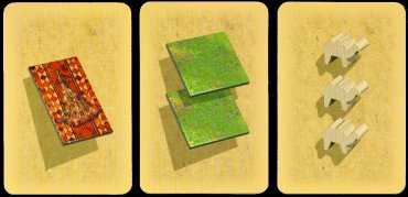 | Spelmateriaal: spelbord, 88 landschapsplaatjes, 62 waarderingsplaatjes, 54 speelkaarten, 100 kamelen, 20 speelpionnen, 5 rangplaatjes |