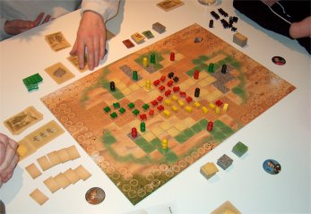 Waardering: Het systeem waarbij je je eigen kaarten aan je tegenstanders moet aanbieden is zeer vernuftig bedacht. De aandacht van de andere spelers en de interactie is hierdoor gewaarborgd en dat maakt een spel altijd leuker. Voor spelers die het leuk vinden om de tegenstanders dwars te zitten is ook het plaatsen van de landschapsplaatjes en de kamelen erg leuk. Goed.