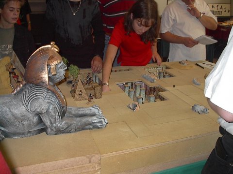 et speelveld van The Mummy, de ontsnappingsboot, langzaam opgraven en een prachtig miniaturen gevecht.28 september 2002: Ook dit jaar leek het aantal bezoekers een stuk lager dan in voorgaande jaren. Ook het aantal activiteiten leek wel minder. Het aangekondigde computernetwerk was niet aanwezig en enkele winkeliers gingen vroegtijdig al weg. Toch heb ik me de hele dag wel vermaakt, voornamelijk met diverse bordspellen bij Ducosim. Lees het uitgebreide verslag voorzien van foto's.