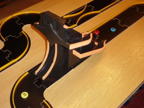 De onderplaat is inmiddels ook op maat gemaakt. Een overtollig startstuk heeft het moeten ontgelden en er tussen verlijmd is een stuk hardboard. Aan de kopse kant van de originele baanstukken is inmiddels een gedeelte van de toplaag verwijderd. Hier zal de schans in worden verlijmd. De voorzijde bestaat uit een schans over de hele breedte en de achterzijde is slechts een smalle schans die de steen zal moeten geleiden verder het parcours af.