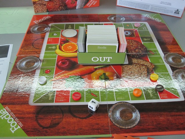 Toevallig liep ik Sandra en Enrico weer tegen het lijf. Zij waren het spel Foodle aan het spelen. Niet echt een spel waar spellenliefhebbers warm voor lopen, maar het werd leuk, omdat het spel niet alleen in een Engelse versie, maar ook in een Zuid-Afrikaanse versie te spelen was. En dat was voor ons Hollanders natuurlijk een leuke uitdaging. Doel van dit spel dat over gezond eten gaat is als eerste het bord rond te lopen. Je moet eerst een vraag beantwoorden en als die goed is, mag je met de dobbelsteen gooien en je pion vooruit zetten. Het vakje waar je op uit komt, geeft je soms nog een opdracht of een kanskaart. Soms moet je verplicht water drinken. De vragen gaan allemaal over eten en daarna wordt er een aanvullende tekst met informatie gegeven. Het leukste was nog om de Zuid-Afrikaanse teksten te begrijpen. Weet jij wat aardappelskyfies zijn? Even nadenken en je begrijpt dat daar chips mee bedoeld worden. De standbemanning bestond uit de ontwerpster van het spel en haar man. De ontwerpster is diëtiste en haar man heeft geassisteerd bij het wetenschappelijk verifiëren van de antwoorden. Ze waren erg enthousiast en konden veel over voeding vertellen. Het spel verkocht ook goed, want op zaterdag was alles uitverkocht.