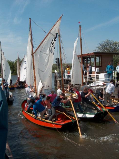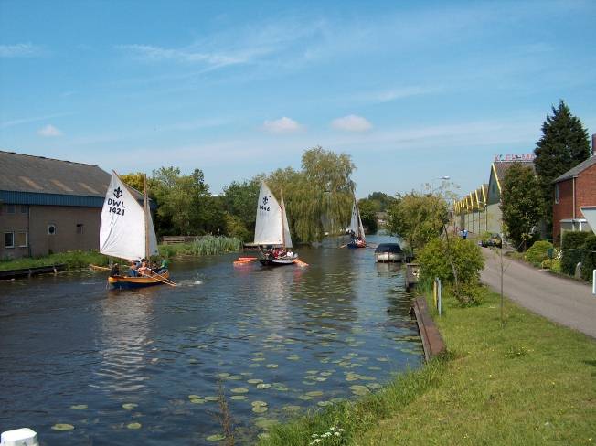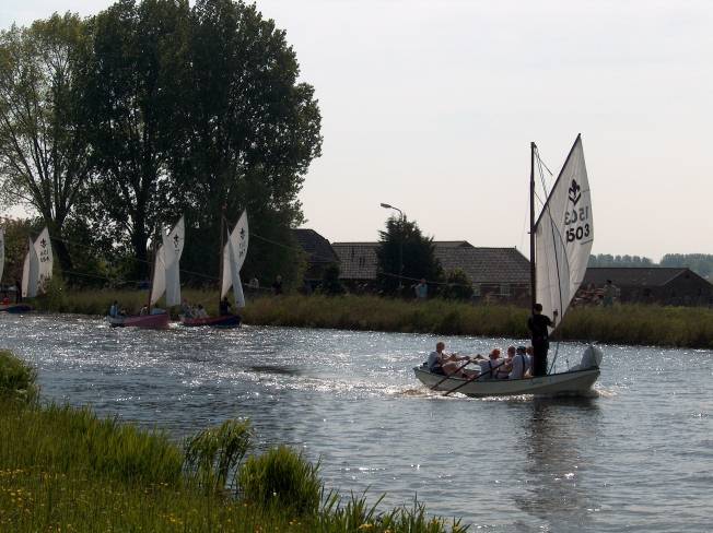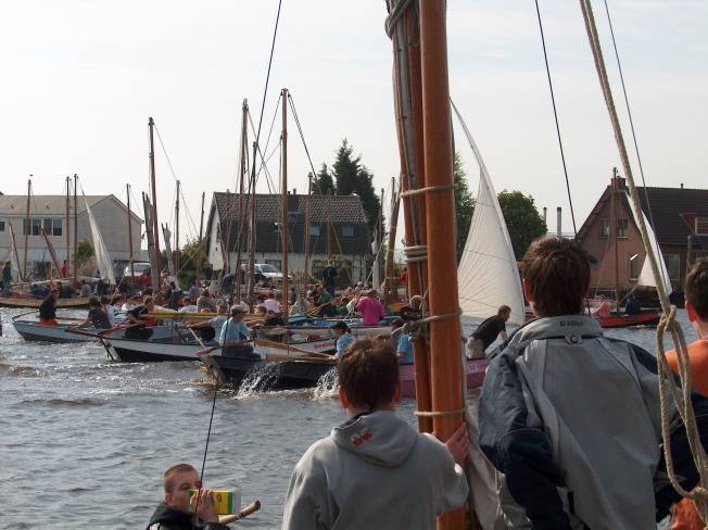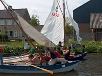 Het is een mooi gezicht. De Vijfgatenbrug is behoorlijk laag en de iedereen duikt in de boot om onder de brug door te komen. Dan snel de mast weer omhoog en op weg naar het Braassemermeer. |