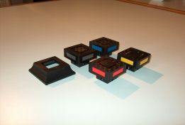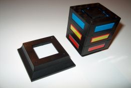 De doos van Cameleon / Een basis en enkele stenen / Gestapelde stenen: de grijze is rood geworden en de rode geel...