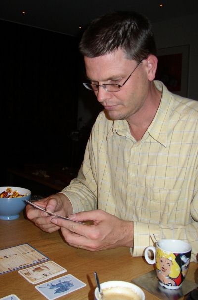 Thea verliet rond 23.30 uur het strijdtoneel en eigenlijk wilde Remco nog even kort naar Palazzo kijken. Eenmaal het spel uitgepakt besloten we ondanks het eigenlijk al te late tijdstip toch nog een keer de glazen te vullen en een potje te spelen. De berichten over het spel waren tot nu toe wat lauw, maar al spelend bleek dat wij het zeer vermakelijk vonden. Door rechtstreeks te kopen of door te veilen moeten de spelers huizen bouwen. Dit kan in allerlei verschillende combinaties waarbij het de meeste punten oplevert als dit lukt in 1 kleur, met veel ramen en deuren en zo hoog als mogelijk oplopend van 1 tot en met 5. Verschillende tellingen zijn er voor afwijkingen in deze ideale opbouw. Veel en veel beter dan verwacht en volgens Esther en Ingvild ook erg goed met zijn tweeën te spelen.