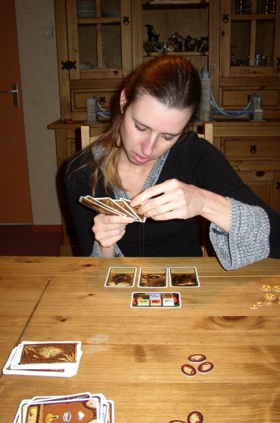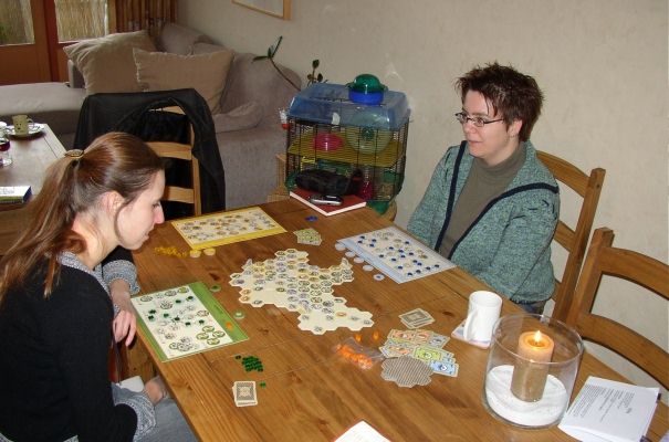 Hierna Durch die Wüste, het woestijnspel van Knizia. Het viel op dat alle spelers een leuk gebied wisten af te bakenen, daar zat de echte winst dus niet in. Het verschil bleek te zitten in de lengte van de karavanen. Remco miste 2 meerderheden op 1 kameeltje en moest dus wederom lijdzaam toezien dat de puntenfiches naar de tegenstanders gingen. Na de telling bleken Esther en Ingvild beiden 75 punten te hebben en Remco was blijven steken op 70. Het spel had nog geen half uur geduurd, maar toch denk ik dat iedereen er wel weer over te spreken was.