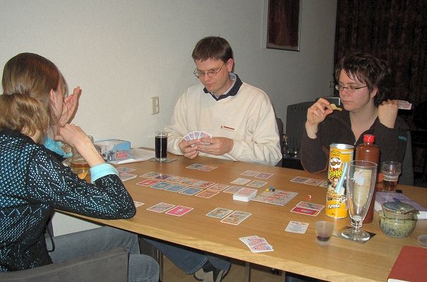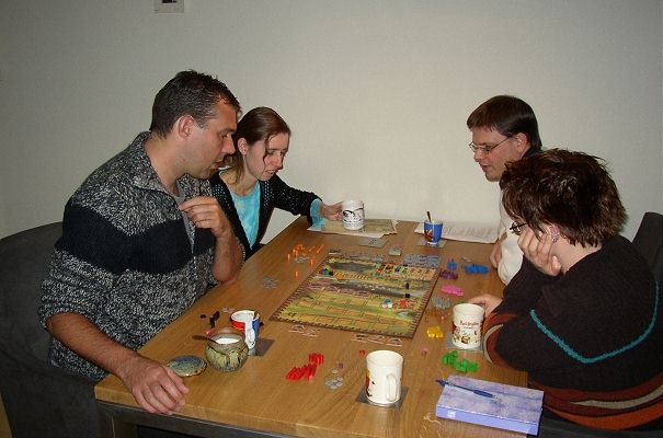 Rond half 8 was de groep compleet. Remco en Sarah hadden het spel al op tafel uitgestald en een ieder schoof automatisch aan op de plek waar zijn of haar kleur aan speelstukken was neergelegd. Opmerkelijk, daar er doorgaans ook nog wel eens om de speelkleur gevochten wordt.