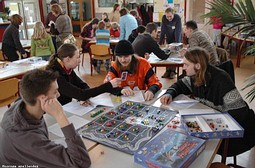We waren net op tijd klaar (10:30 uur) toen de eerste mensen binnenkwamen. Dit waren voornamelijk deelnemers aan het Magic en Warhammer toernooi. Dit zijn in het begin altijd een beetje stressmomenten maar toen de toernooien eenmaal bezig waren, keerde de rust terug. We hadden een flink aantal deelnemers aan de toernooien. Het Kolonisten van Catan toernooi had echter geen enkele deelnemer. Hopelijk was dit nog een beetje nieuwigheid, en is de volgende keer helemaal vol.