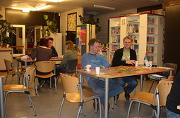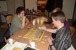 Esther, Michiel en Ronald bij Kaiser, fantastisch spel waarbij de tijd omvloog. Ronald won met 29 punten, Remco 25, Esther 22, Michiel 21.