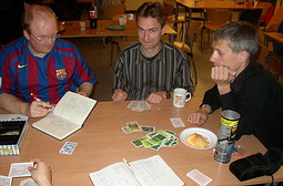 Michiel showt Wizard. Boerenbridge met 2 extra kaarten die de geluksfactor wel vergroten. Wizard gaat zeker in onze spellenkast terecht komen, maar het echte Boerenbridge heeft toch mijn voorkeur. Buiten de 2 extra kaarten vervalt het blind neerleggen van de lucifers en wordt één voor één de voorspelling qua aantal te halen slagen opgeschreven. Hiermee kan je dus alsnog je idee bijstellen. Toch een veel en veel leukere variant dan bijvoorbeeld het wel heel erg slappe Canyon. Remco 330, Ronald 270, Michiel 270, Esther 230.