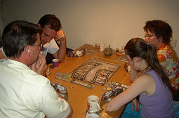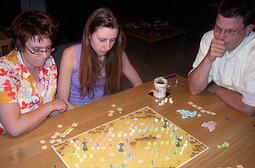 De karavanen groeien gestaag. We spelen met 4 kleurgroepen aan kamelen en zodra één kleurgroep op is stopt het spel, worden er nog punten gegeven voor de afgebakende gebieden en de langste karavaan in elke kleur. Het is een eenvoudig meerderheidsspelletje waarbij het met 5 spelers toch wel een behoorlijk vol speelbord is. Het wordt allemaal wat onoverzichtelijker wat er toe leidt dat een ieder zich op een beperkt gebied van het bord schijnt te richten. Het is verder opvallend dat het spel met 5 spelers binnen 20 minuten gespeeld is. De verwachting was dat het spel wat meer tijd in beslag zou nemen. Het tweede spel van de avond blijkt in deze setting meer iets weg te hebben van een tussendoortje.