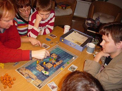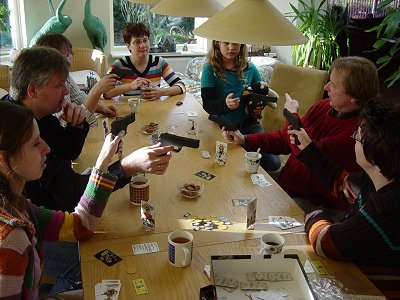 Hierna kwam het spel Cash’n guns op tafel. Met 6 bankrovers de poet verdelen middels het richten van je geweer op je tegenstander. Je kiest van tevoren een kaart uit (bang kaart of klik klik) en daaruit blijkt of de door jou uitgezochte speler nog mee mag doen met het verdelen. Inmiddels waren Esther en Ingvild gearriveerd dus we besluiten het nogmaals te spelen. Hierna begint het echte werk. De ene groep buigt zich over Kreta, de andere groep gaat Yspahan spelen. Kreta is dit jaar gekocht in Essen, echter helaas, de groene steden ontbraken. (inmiddels is het spel weer kompleet, dankjewel Goldsieber).