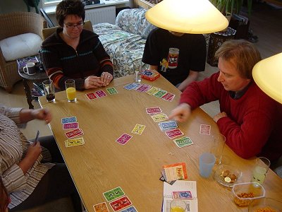 Kreta is een meerderhedenspelletje waar je zelf het moment kan bepalen wanneer er gewaardeerd kan worden. Helaas kan je niet zelf bepalen wat er gewaardeerd mag worden, dus er zit wel enige geluksfactor in dit spel. De andere groep is nog heftig aan het spelen dus wij besluiten een klein kaartspelletje te gaan doen, Null und nichtig. Lekker simpel, je start met 3 kaarten opengedraaid voor je, in verschillende kleuren, en als je een slag wint leg je de gewonnen kaart op de stapel. Aan het eind van het spel telt je het aantal punten van de bovenliggende kaarten.