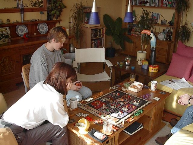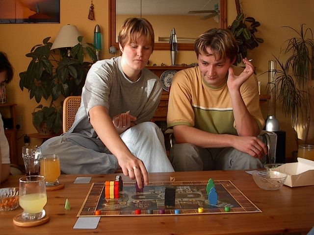 Jeroen en Monique bij Hilly Billy Het spel op zich blijkt echter niet helemaal goed getest te zijn. In principe is het een racespel, waarbij de spelers geld verdienen door regelmatig over de finish te komen. Het rijden op zich kost echter geld. Het blijkt meer geld te kosten dan het oplevert, dus kun je beter stil blijven staan. Ondertussen is het een gokspel, waarbij spelers zich voor gevaren kunnen verzekeren. Dit kan de spelers nog geld opleveren en/of kosten. De meesten raakten langzaam maar zeker door hun geld heen. Alleen Rob wist lange tijd een positieve score te houden. Na twee uren rijden waren Jeroen en Det door hun geld heen en besloten we maar te stoppen. De race was nog lang niet ten einde. Eindstand: Monique 72, Rob 66, Ronald I 39, Jeroen 2, Det 0. Monique had dus toch nog Rob weten in te halen. Het spel heeft leuke elementen, alleen klopt het niet helemaal en duurt het veeeel te lang. De avond werd afgesloten met Kardinal & König in combinatie met de uitbreiding der Vatikan. Met behulp van een joker kan een speler een raad in het vatikaan plaatsen en daarbij dubbel scoren bij bepaalde raden of kloosters. Jeroen en Ronald I maakten daar al snel gebruik van. Het spel bleek ook een strijd tussen Ronald I en Jeroen te worden. Ronald I wist een hele lange keten van kloosters te vormen, terwijl Jeroen zich op de raden richtte. Ronald I vergat een van die mogelijke raden te blokkeren voor Jeroen en daarmee gaf hij de overwinning uit handen. Tijdens het spel bleek nog een foutje gemaakt te zijn met het vatikaan (deze geldt alleen voor de eindtelling, waardoor Ronald I en Jeroen eigenlijk 5 punten teveel hadden gescoord). Eindstand: Jeroen 59, Ronald I 52, Rob 31, Monique 30 en Det 24. Het was helaas weer tijd om de terugreis te aanvaarden. Weer een prima geslaagde spellensessie. Eindstand van de dag (zonder M): Ronald I 13, Jeroen 16, Rob 18,5, Monique 20, Det 22,5. |