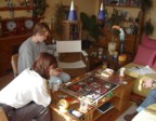 | Locatie: bij John & Fenny in Amstelveen vanaf 20.00u. Spelers: John, Fenny en Ronald I. De jaarlijkse spellenavond op eerste Kerstdag. Ronald I had weer zorgvuldig enkele spellen geselecteerd, maar eerst kwam Baantjer op tafel, een sinterklaas cadeau dat Fenny had gehad. Het idee achter het spel leek heel leuk. Elke speler moet 3 zaken oplossen door informatie te verzamelen. Het uiteindelijke spel blijkt zwaar tegen te vallen. De spelregels vergeten een heleboel zaken te vermelden en de spelers kunnen tijdens het spel maar heel weinig invloed uitoefenen. Voor elke zaak moeten namelijk 4 kaarten worden verzameld: informatie van twee medewerkers en 2 delen van het moordwapen. Tezamen leveren deze een dader op. Deze kaarten worden verzameld door op groene en rode vakjes te komen. Dit wordt bepaald door de dobbelsteen. Als echter iemand anders je tweede deel van het moordwapen vindt, gaat dit onderop de stapel en kun je weer de hele stapel doorspelen, voordat je weer een kans op het moordwapen maakt. Eenzelfde probleem geeft de informatie van de dokter. Als je deze eenmaal aan een zaak hebt gekoppeld, kun je deze niet meer loskoppelen. Als nu de beoogde dader inmiddels door een andere speler is gepakt, kun je je hele zaak niet meer oplossen. Na anderhalf uur spelen zijn we maar gestopt. John had inmiddels 2 zaken opgelost en Ronald I en Fenny elk 1. Dit spel zal wel niet meer op tafel komen. | Daarna kwam Carcassonne op tafel. Het eerste spel vertelde Ronald I nog enkele tactische tips om zo snel alles te leren kennen. Eindstand: Ronald I 98, Fenny 70, John 48. Het tweede spel duurde duidelijk langer. John richtte zich nu op de boeren, terwijl Fenny een grote stad probeerde te stichten. Ronald I ging de strijd aan met de boeren en kwam op gelijke hoogte met John, maar had nog 2 boeren achter de hand. Deze wist hij uiteindelijk ook te verbinden, waardoor hij als enige maar liefst 10 steden wist te scoren. Eindstand: Ronald I 98, Fenny 65, John 53. Het was inmiddels al laat, maar een spelletje Mamma Mia kan natuurlijk nog wel. De eerste ronde was uitproberen voor John en Fenny, waarbij het verschil tussen de pizza Monotoni en de pizza Minimale duidelijk werd. Ronald I toonde hoe de ene bestelling na de andere kon worden gemaakt. Hij kwam tot 7, terwijl John en Fenny op 3 bleven steken. Fenny had nog ingrediënten over, dus pakte ze alsnog de tweede plaats. Eindstand: Ronald I 7, Fenny 3, John 3. Een revanche was op zijn plaats. Ronald I had het nu een stuk moeilijker en enkele bestellingen liepen uit op een mislukking. John had het spel goed door en als een volleerd pizzabakker maakte hij 6 bestellingen in orde. Eindstand: John 6, Ronald I 5, Fenny 4. |