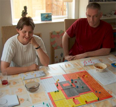 Sandra en Rob bij All Terrain Rally Er werd besloten het spel nogmaals te spelen, maar nu over 3 rondes, waarbij elke coureur een complete ronde moest afleggen. Nu moest er gedwongen ook over "slechte" ondergrond worden gereden. Tevens kwamen er obstakels in het spel. Het spel werd nu een stuk levendiger en interessanter om te spelen. Ronald I had echter al snel een voorsprong genomen en wist deze ondanks tegenwerkingen van de anderen te behouden. Deze aanpassingen waren duidelijk een verbetering van het spel, maar toch vond Ronald I het nog te "lief". Tevens waren er iets te weinig echte beslissingsmomenten. Maar al met al heeft het zeker potentie. |
