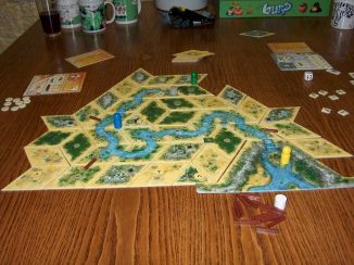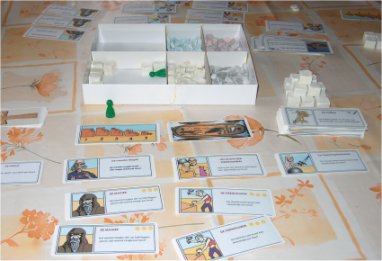De eindstand van Lost Valley Met Enrico en Sandra speelde Ronald I nog het nieuwe Lost Valley. Daarin zijn de spelers goudzoekers die er met hun rugzak op uit om goud te zoeken. Het spelbord wordt langzaam maar zeker ontdekt en met het gevonden goud worden voorwerpen gekocht, die het zoeken naar meer goud vergemakkelijken. Wie aan het eind van het spel het meeste goud heeft, wint. Het spel kwam de eerste keer een beetje traag op gang, maar bleek heel leuk te zijn. Ronald I en Enrico kochten al snel een wagen om hun boomstammen te vervoeren, die nodig waren om de goudmijnen te stutten. Sandra kwam er te laat achter dat er maar 2 wagens in het spel zaten. Ze was wel de eerste die het spel kon beëindigen en dat deed ze dan ook. Helaas had Enrico zoals verwacht veel meer goud verzameld en hij won het spel. Er waren nog wat vragen gerezen, die naar de ontwerpers werden gestuurd. De volgende dag waren de antwoorden al binnen. Dit spel wordt de komende tijd zeker vaker gespeeld. Het was inmiddels al na enen, de hoogste tijd om af te sluiten. |