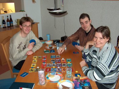 | Locatie: bij Jeroen en Monique in Hoofddorp vanaf 20.00u. Spelers: Jeroen, Monique, Lody, Willem, Sacha, Enrico, Sandra, Susan en Ronald I. De avond zou oorspronkelijk bij Seb en Leonie gehouden worden, maar vanwege hun 1-jarig huwelijksjubileum had Seb een verrassing voor Leonie in petto. Er werd dus uitgeweken naar Jeroen en Monique. De avond stond voor een deel weer in het teken van trainen voor het NK. Sacha, Susan, Monique en Ronald I begonnen met Alexandros. Voor Susan was dit spel nieuw. Na een aarzelend begin pikte ze het snel op. Ronald I nam direct in het begin een voorsprong. Monique probeerde met een groot gebied snel in te lopen. Daarmee haalde ze wel de andere spelers in, maar ze liep te weinig in om Ronald I te bedreigen. Onverwachts snel was het spel afgelopen. Eindstand: Ronald I 40, Monique 27, Susan 26, Sacha 18. Sacha was erg teleurgesteld in het resultaat, te meer omdat het al weken erg moeizaam gaat met de spellen. De Bruggen van Shangrila was voor Susan ook nieuw. Ronald I besloot de acties van Sacha te volgen en hij wist een paar aardige bolwerken te maken. De dames sloegen de handen echter ineen en voor hij het wist, was hij afgesloten van de andere helft van het bord. Susan had inmiddels ook een grote macht opgebouwd en begon Monique en Sacha te bedreigen. Monique moest het spel uitmaken en ging er van uit dat ze daarmee de tweede plaats nog kon halen. Een telfoutje gooide haar terug naar de derde plaats. Eindelijk weer een overwinning voor Sacha. Eindstand: Sacha 25, Susan 23, Monique 22, Ronald I 16. | Het volgende spel dat op tafel kwam was Torres. Het was even diep graven hoe het ook alweer precies ging. Voor Susan en Sacha was het zelfs de eerste keer. In het begin bouwde iedereen aan een eigen burcht, maar al snel werd er overal ingebroken en werden actiekaarten ingezet om de anderen dwars te zitten. Het spel werd steeds interessanter, maar in de laatste beurt kon er niet veel nuttigs meer worden gedaan. Susan had het wederom erg goed gedaan en ze werd al gevraagd reservespeler te worden voor het NK team. Eindstand: Susan 241, Ronald I 229, Sacha 224, Monique 221. Tot slot van de avond nog Puerto Rico het kaartspel. Ronald I kreeg beide gildehallen toebedeeld, maar slechts weinig productiegebouwen. Hij stapte daarna maar over op de monumenten en hield de tweede gildehal zo lang mogelijk achter de hand. Susan begon erg goed met de prefectuur en de bibliotheek en zwom in de kaarten. Ze bouwde er lustig op los. Monique werd overstelpt met productiegebouwen die ze juist niet wilde hebben. Sacha leek overal achteraan te lopen en maar niet de goede kaarten te krijgen. Toen Ronald I ook nog het paleis kreeg was de overwinning bereikt. Eindstand: Ronald I 31, Susan 29, Monique 26, Sacha 25. Het was inmiddels al erg laat, dus gingen de meesten snel naar huis. Volgende week bij Lody en Caroline in Sassenheim. |