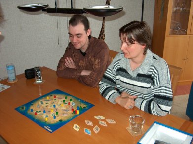 | Locatie: bij Jeroen en Monique in Hoofddorp vanaf 20.00u. Spelers: Jeroen, Monique, Seb, Leonie, Rutger, Lody, Ronald I. Voor Rutger stond oefenen voor het NK op het programma. Hij had nog nooit het Puerto Rico kaartspel gespeeld, dus dat had de hoogste prioriteit. Ronald I had het nieuwe Maharadja meegenomen en legde het uit aan Jeroen, Monique en Lody. Toen hij klaar was, schoof hij aan bij Seb, Leonie en Rutger voor het Puerto Rico kaartspel. Voor Rutger was het erg aftasten wat nu een goede strategie was. Ronald I leek erg goed te gaan, maar hij scoorde uiteindelijk toch te weinig punten. Eindstand: Seb (21+9=) 30, Leonie (17+6+5=) 28, Ronald I (12+5+8=) 25, Rutger (17+4=) 21. Daarna de Bruggen van Shangrila. Ronald I werkte min of meer samen met Leonie, waardoor steeds gezamenlijk kon worden uitgebreid. Af en toe moest hij even Seb dwars zitten om niet van het bord afgegooid te worden. Seb lijkt nog moeite te hebben met bepaalde aspecten uit het spel. Rutger zat slechts aan één kant van het bord goed in het spel. Ronald I zag over het hoofd dat Leonie het spel uit zou kunnen maken en plaatste in zijn laatste beurt zijn stukken in een "verkeerde" stad en gaf daarmee de overwinning aan Leonie. Eindstand: Leonie 22, Ronald I 19, Seb 18, Rutger 16. | Seb en Leonie gingen naar huis en Rutger en Ronald I speelden nogmaals het PR kaartspel. Ronald I had snel de bibliotheek die met twee spelers wel heel erg sterk is. Daarnaast had hij de smelterij en bouwde vervolgens alleen maar productiegebouwen. Hij was echter op zoek naar een groot gebouw en dat kwam maar niet. Dus diverse malen werd de raadsheer ingeschakeld. Rutger zag het helemaal niet meer zitten en zorgde dat het spel snel afliep. Groot was zijn verbazing dat het verschil helemaal niet zo groot was, omdat Ronald I weinig punten voor zijn gebouwen scoorde. Eindstand: Ronald I 23, Rutger (15+4=) 19. Toen Lody naar huis was, speelden de overgebleven spelers nogmaals het PR kaartspel. Het spel werd nu beslist in de laatste beurt, toen Monique nog een groot gebouw kon bouwen, waarmee ze 8 punten scoorde, voldoende voor de overwinning. Eindstand: Monique (17+6+8=) 31, Ronald I (23+2=) 25, Jeroen (15+8=) 23, Rutger (18+4=) 22. Het was inmiddels alweer veel te laat. Volgende week bij Ronald I in de Kwakel. |