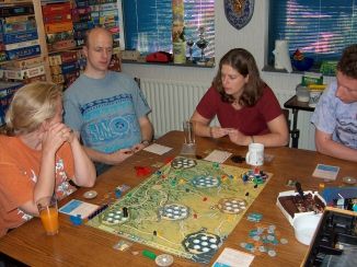 | Locatie: bij Lody en Caroline in Sassenheim vanaf 20.00u. Spelers: Seb, Leonie, Lody, Caroline, Jeroen, Monique, Edwin en Ronald I. De groep werd in tweeën gesplitst. Lody, Monique, Edwin en Ronald I speelden Goa. Aan de andere tafel werden in dezelfde tijd 3 andere spellen gespeeld. Lody had Goa al een keer gespeeld en kon het spel in grote lijnen uitleggen. Toch moest er nog diverse keren gebruik worden gemaakt van het regelboekje. Het spel wordt gespeeld in twee maal vier rondes. In elke ronde worden er 4 tegels geveild, die de spelers bepaalde voordelen bieden. Elke speler heeft een ontwikkelingskaart met 5 kolommen. Door deze kolommen te ontwikkelen krijgt de speler niet alleen meer mogelijkheden, maar ook meer punten. Het ontwikkelen wordt wel steeds lastiger. Voor de eerste stap is een bepaald handelsgoed nodig plus een schip. Voor de tweede stap al twee goederen en twee schepen. Het is dus zaak om aan deze goederen en aan de schepen te komen. Bij de te veilen tegels zitten o.a. plantages die direct voorzien zijn van enkele goederen. Als deze goederen zijn gebruikt voor ontwikkeling kun je door middel van productie weer opnieuw goederen in deze plantages krijgen. Nadat de 4 tegels en het startspelerkaartje zijn geveild, krijgen de spelers 3 acties, die om beurten worden uitgevoerd. De eerste mogelijkheid is het nemen van nieuwe schepen nemen. Afhankelijk van de ontwikkeling op je schepenkolom krijg je dan een aantal schepen, die je weer kunt gebruiken voor andere ontwikkelingen. De tweede mogelijk is productie. Afhankelijk van de ontwikkeling in de productiekolom kun je een aantal nieuwe goederen produceren, mits je ruimte hebt in je plantages of koloniën. De derde mogelijkheid is het nemen van geld, erg handig voor de volgende veilingen. De vierde mogelijkheid is het nemen van actiekaartjes. De kunnen je direct voordeel geven of andere acties verbeteren. Afhankelijk van je ontwikkeling mag je er een aantal nemen en een aantal vasthouden. De laatste mogelijkheid is het stichten van een kolonie. Je trekt daartoe twee kaartjes die een aantal kolonisten tonen. Daarbij tel je de ontwikkelingen van je kolonistenkolom. Als je dan nog niet voldoende kolonisten voor de nieuwe kolonie hebt, mag je nog kolonisten uit je hand aanvullen. Heb je voldoende, dan sticht je een kolonie. Heb je niet voldoende, dan krijg je als troost een nieuwe kolonist. Deze actie was erg van invloed op het spel, Lody en Edwin hadden erg veel geluk met deze actie en slaagden voor lastige tests. Ronald I en Monique verloren kostbare acties met mislukte pogingen. | Edwin had een erg goede