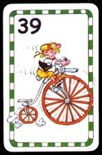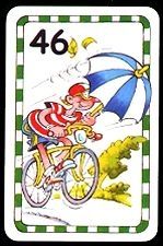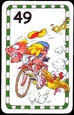 | Spelmateriaal: 84 snelheidskaarten van 39 t/m 50 km/u met grappige afbeeldingen. 5 bergkaarten, 5 tegenwindkaarten en 5 sprintkaarten. 1 houten steen (de gele trui), 20 blauwe fiches en 20 rode fiches |