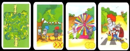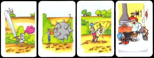 Wapenkaarten, bij de ingang van de grot staat een wapenhandelaar. Je kunt 1, 2, of 3 wapens kopen. Er zijn 2 amuletten (hiermee win je het niet van de draak), 1 goedendag en 1 zwaard. Ieder wapen kost 1 goudstuk, houd de wapenkaarten gesloten voor je op tafel.