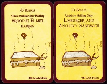 | Spelmateriaal: 168 kaarten, onderverdeeld in kerkerkaarten en schatkaarten Verder benodigd: per persoon 10 fiches (munten, schijfjes of iets dergelijks) en een dobbelsteen. |