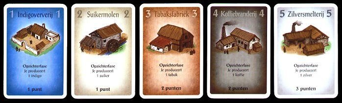 De gebouwen die de spelers bouwen leveren niet alleen winstpunten op, maar beïnvloeden ook het spel. Allereerst zijn er 5 verschillende productiegebouwen. Dit zijn tevens de enige gebouwen waarvan de spelers er meer mogen bouwen. Er zijn 5 soorten goederen, die verschillende waardes hebben bij het handelshuis. Hoe duurder het productiegebouw hoe groter in het algemeen de opbrengst bij verkoop.