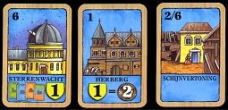Er zijn enkele speciale gebouwen. De schijnvertoning kost 2, maar telt voor 6 als hij wordt vervangen door een ruilkaart. De sterrenwacht geeft elke ronde de mogelijkheid om af te zien van het punt en daarvoor een kaart van een stapel te trekken. Deze kan worden gekocht, in de hand worden genomen of afgelegd worden. De herberg geeft je de mogelijkheid om bij elke blauwe telling maximaal 5 punten te kopen voor 2 Roebel per stuk.