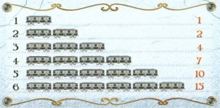 | Spelmateriaal: 1 spelbord, 240 plastic treinwagons, 144 speelkaarten, 5 scoreblokjes |