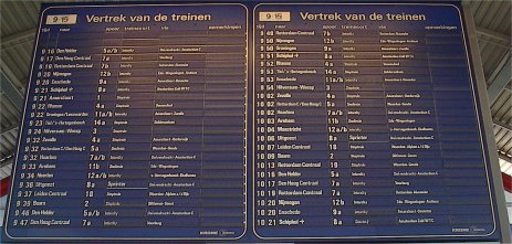 onder het grote blauwe bord in de centrale hal met de vervoersinformatie