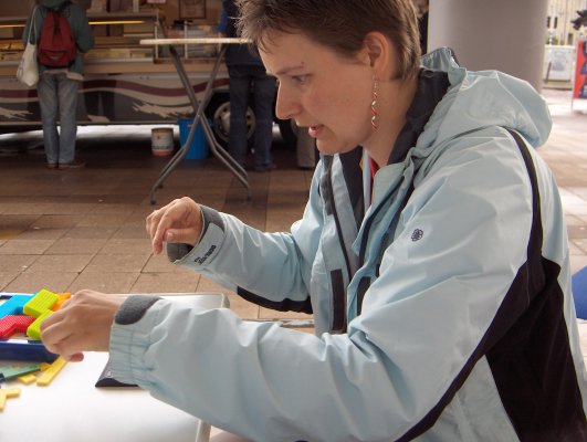 Sandra is geconcentreerd bezig met een puzzel. Alleen Danny weet een puzzel op te lossen.
