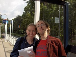 Het bleek lastig in deze eeuw om nog een walkman te bemachtigen, omdat zelfs discmans al verleden tijd beginnen te worden. Gelukkig was de spelleiding zo vriendelijk om er een ter beschikking te stellen. Ook een regenbui op de vroege ochtend kon de pret niet drukken. We hebben veelvuldig heen en weer gereisd met de tram om op allerlei locaties te Amstelveen en omstreken foto's te nemen dan wel bolletjes te tellen. Ik wil bolletjes koekjes, maar bij gebrek aan koekjes (of de Bossche bollen van vorig jaar) zijn we maar naar de supermarkt gegaan om voor twee euro een lunch te kopen. Fruit blijkt vrij duur à 50-70 cent per appel, maar er is een peer van zeventien cent, een blikje tomatenpuree voor zeven, en een druif voor een halve cent. De vakkenvuller had nog wat suggesties van veertig cent elk, maar we zaten al aan ons budget. Een uurtje achter het scherm zitten in een cybercafé was nuttig om ons vragenlijstje verder af te werken, tot bleek dat we geacht werden ons te melden bij een snackbar voor het uur om was. Terwijl ik dit schrijf bedenk ik me dat we de 2e bonusvraag helaas hebben misgelopen, omdat we heen en weer aan het trammen waren en in de verkeerde waren gaan zitten. Je gaat wel door je strippenkaart heen op zo'n dag. 's Middags was het zonnig maar toch ging er bijna niemand op de al eerder genoemde bollen zitten, gek hè. De drie rozen zijn een beetje verlept door de zon, maar er stond nergens dat het geen droogbloemen mochten zijn. Ik denk dat dit wel 250 woorden zijn nu, dus op naar de volgende vraag.