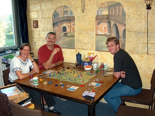 In de middag kwamen Sandra en Enrico al naar Ronald I en in de avond kwamen daar Rob en Det bij. Vanwege files en omleidingen waren Sandra en Enrico wat later dan gepland, dus werd er maar snel met spelen begonnen. Als eerste Expedition Pyramide. Sandra had wat meer moeite dan de heren met de puzzeltjes en was daarom wat minder fanatiek. Toch ging het spel nog best gelijk op en pas in de laatste beurt viel de beslissing. Ronald I wist de laatste beurt en daarmee het spel te winnen. Eindstand: Ronald I 7, 4, 2, 2, 2, Enrico 6, 4, 4, 2, 1, 1, Sandra 5, 3, 2, 2, 2. Het spel werd bestempeld als een leuk familiespel. Als intermezzo werd even Bongo gedemonstreerd: een klein dobbelspelletje wat duidelijk niet aan Sandra en Enrico was besteed. Dus maar snel door met Eufraat & Tigris, een klassieker die Enrico nog nooit had gespeeld. Ronald I verzorgde de uitleg, maar de eerste beurten was het voor Enrico toch even kijken hoe alles nu in elkaar greep. Het middenspel was erg spannend en er werden flinke slagen uitgevochten. In het eindspel werden er ineens veel monumenten gebouwd en werd er flink geïncasseerd. Ronald I en Enrico lagen daarbij voortdurend met elkaar in gevecht, terwijl Sandra veel blokjes binnenhaalde. Ronald I zag in dat hoe langer het spel duurde, hoe groter de kans was dat hij laatste zou worden. Dus zorgde hij er voor dat het spel eindigde, door Sandra een schat te schenken. Helaas voorkwam hij er niet mee dat hij laatste werd. Eindstand: Sandra 8, 9, 10, 12, Enrico 7, 8, 12, 16, Ronald I 7, 7, 8, 10.