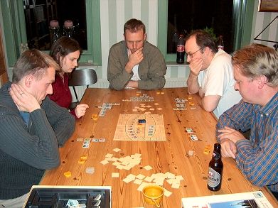 Het derde spel van de dag was Tadsch Mahal. Ronald I moest spelen tegen Peter, Marjolein, Albert en Jerry, de nummers 1 tot en met 4 op dat moment. Een zware partij dus, maar wellicht zou hij kunnen profiteren van de onderlinge strijd. Albert werd al snel tegengewerkt en moest even de klap te boven komen om weer echt mee te kunnen spelen. Peter was heel berekenend en verzamelde vooral veel kaarten. Ronald I koos voor de +2 bonuskaart en probeerde deze zo snel mogelijk binnen te halen. Toen hij deze binnen had, sprokkelde hij steeds 2 punten en probeerde met 1 paleis telkens ook een bonusfiche te verzamelen. Hij blokkeerde vooral de gele inbreng, om maar zo lang mogelijk de bonuskaart te kunnen gebruiken. Af en toe probeerde hij een aanval met de olifanten. Marjolein overspeelde haar hand in de eerste rondes en bleef daar een beetje door achter. Jerry wist uiteindelijk de bonuskaart van Ronald I af te nemen en liep snel op hem in. De anderen lagen op grote achterstand. Het leek erop of Jerry de overwinning gemakkelijk kon pakken, maar hij viel stil en nu was het Peter die dichterbij kwam. Ronald I pakte de bonuskaart weer van Jerry af en liep weer uit. Ondertussen verzamelde hij een grote serie kaarten voor de eindsprint. Albert kwam ineens ook nog goed opzetten, maar het kostte hem teveel kaarten om door te kunnen drukken. Toen de rookwolken waren opgetrokken bleek Ronald I gewonnen te hebben. Peter was erg in zijn nopjes met zijn tweede plaats. Hij had al zijn concurrenten achter zich gelaten en de grootste concurrenten nog eens op de grootste achterstand. Eindstand: Ronald I 43, Peter 38, Jerry 37, Marjolein 33, Albert 33. Albert had toch nog een half puntje extra kunnen sprokkelen door gelijk met Marjolein te eindigen. Wellicht zou dat nog van pas komen.