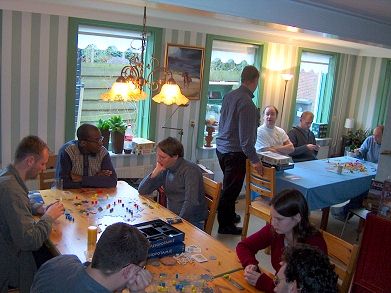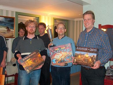 Daarna was het tijd voor soep met broodjes. Dat liet iedereen zich goed smaken. De prijsuitreiking was kort maar krachtig. Harvey werd laatste met 9 punten en kreeg als troostprijs het spel "Wie is de Ezel?". De derde prijs ging naar Jerry, de tweede naar Albert en de nieuwe kampioen werd Peter. Een heel geslaagd en gezellig toernooi. Met dank aan de organisatoren voor de uitnodiging en de gastvrijheid van de ouders van Wim. Remco zou trouwens tweede geworden zijn als hij in Mesopotamië 1 mana meer had gehad in het eindspel. Is hij misschien één keer vergeten om mana te verhogen tijdens een van zijn beurten? Het zou zo maar kunnen. Marjolein is in de laatste rondes nog flink teruggevallen. De subtop zat duidelijk dicht bij elkaar. Bij een gelijke stand werd trouwens gekeken naar het onderlinge resultaat van de spelers.