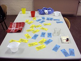 Voordat we met opruimen begonnen, snel een spelletje Fiji. De laatste rondes werden een beetje afgeraffeld, want veel tijd om na te denken was er niet. Eindstand: Rob 5, Willem 4, Ronald I 3. Daarna snel de spellen inpakken, want om 0.15u zou het alarm op het gebouw gaan en dan moet iedereen het gebouw al uit zijn. Snel de tafels en stoelen aan de kant en de zaal vegen. De keuken ook weer op orde en alle spellen werden weer in de auto's gepropt. Sandra en Enrico brachten Bianca H naar huis en ik gaf Seb een lift naar het station van Utrecht. Niek en Tanya brachten Erwin weg. De dag was weer voorbij gevlogen.