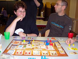Rob werd 40, Erwin 45 en ook Det was jarig geweest. Dus besloten deze verjaardagen tezamen te vieren met een spellendag in Amersfoort. Vanaf 12.00u was iedereen welkom. Vanaf 12.30u begon het een beetje vol te stromen en de eerste spelers begonnen aan een spel. Met Enrico, Sandra en Det speelde ik Spel der Torens. Een nieuw abstract spel van PS Games, gebaseerd op een al wat ouder spel. Iedere speler heeft stenen in zijn eigen kleur met verschillende symbolen. Om beurten mag er een steen verplaatst worden naar een leeg veld of op een andere steen met hetzelfde symbool. Zo ontstaan er torens van maximaal 5 stenen hoog. Een verplaatsing geschiedt in een rechte lijn en je mag alleen over lege velden of over velden waarop je eigen stenen staan. Zodra een steen/toren een eindveld heeft bereikt, mag deze niet meer verplaatst worden en mag de speler nog een beurt doen (dat laatste waren we trouwens vergeten te doen). Het spel eindigt als iemand niet meer kan zetten of als een speler 4 bij elkaar horende eindvelden bezet heeft. In het begin van het spel zijn je mogelijkheden beperkt, maar er komt steeds meer ruimte op het bord en wordt het steeds moeilijker de juiste keuzes te maken. Af en toe moest er flink gedacht worden. Uiteindelijk slaagde Sandra er in 4 eindvelden te bezetten met haar eigen stenen en was het spel af. Je eindscore wordt bepaald door alle stenen/torens die je op een eindveld hebt staan. Alle stenen die in je toren zitten leveren punten op. Omdat Sandra 4 bij elkaar behorende eindvelden had bezet, werden deze punten verdubbeld. Ze won dan ook afgetekend. Eindstand: Sandra 32, Enrico 15, Ronald I 13, Det 12. Het spel is veel leuker dan je in eerste instantie op basis van het spelmateriaal zou verwachten.