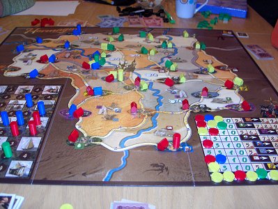 De leden van Scorespoor.nl hadden een spellendag gepland en Ronald I van Spelmagazijn was uitgenodigd. Toen hij aankwam waren ze net met een spelletje Timbuktu bezig. De route werd ingekort, zodat het sneller af zou zijn. Sommige spelers vonden dat helemaal niet erg, want ze waren niet echt bijster enthousiast over het spel. Toen het spel was afgelopen waren er 8 spelers en er werd dan ook gesplitst in twee groepen van 4. Gerard had op verzoek van Ronald I Hermagor voorbereid en Esther en Thea wilden wel meedoen. De andere spelers speelden Puerto Rico. Voor enkele van hen was dit nieuw, zodat een uitleg gewenst was.