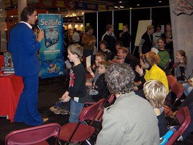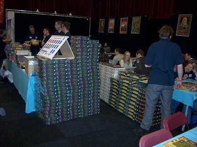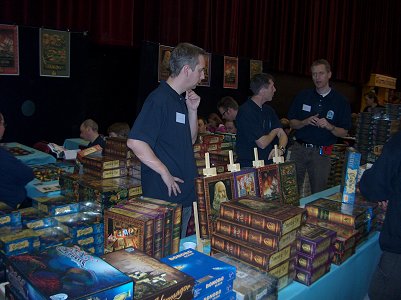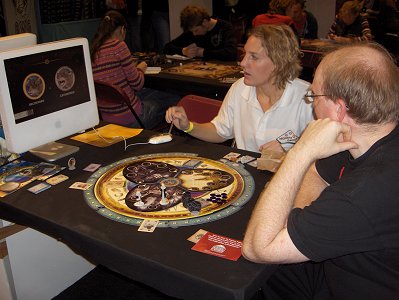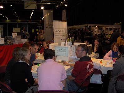 Bij Identity Games was veel elektronica te vinden. Op diverse computers kon het nieuwe LiveQuiz worden gespeeld. Het is een vraag/antwoord spel, maar het leuke ervan is dat de antwoorden in de loop der tijd veranderen. Op internet kun je live het juiste antwoord zien. Zo kun je denken aan: Wie is de president van Amerika? Wie is de kampioen Formule I? Wie presenteerde gisterenavond het NOS Journaal? Sommige antwoorden variëren dagelijks, andere maar eens in de vier jaar. Verder werd het spel SeaLife aangeprezen. In dit spel zitten prachtige filmbeelden van Jacques Cousteau. Vooral de jonge deelnemers zaten al soms een kwartier van tevoren in afwachting van de quiz. Tot slot was er ook het Golden Compass DVD spel. Net als het 999Games heeft Identity Games een spel over de film die in december in de bioscopen gaat draaien. Ik heb een korte uitleg over het spel gekregen. Je moet tijdens het spel kaarten verzamelen, die je kunt inzetten om te verplaatsen of om te vechten. De spelers moeten samen spelen om van het spel te winnen, maar daarnaast moeten ze ook proberen om zelf het spel te winnen. Ik weet niet of de DVD nu heel veel aan het spel toevoegt.
