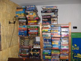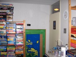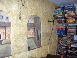 De spellenkamer heeft een kasteelmuur en aan twee wanden rekken met spellen. Een grote tafel en een koelkast maken de kamer compleet. De tafel is groot genoeg voor 8 personen, maar dan is de kamer ook wel helemaal gevuld. De volgende foto's vormen een rondblik in de kamer.