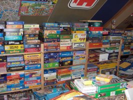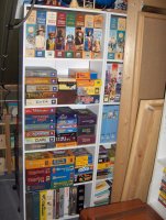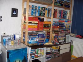 Langs de achterwand hoge diepe rekken met grote spellen. Langs de andere schuine wand smalle boekenkastjes met spellen. Achter deze boekenkastjes staan nog kisten met los spelmateriaal, kaartjes en miniaturen.