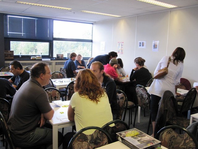 Een overzichtje van een deel van de kantine. Achterin demonstreert The Gamemaster Block It, Tobago, Hotel Amsterdam en Het Koopmanshuis.