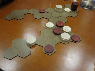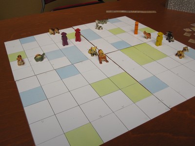 Tot slot heb ik nog een nieuw spel van Corné van Moorsel gespeeld, waarbij je als fotograaf 10 verschillende dieren moet fotograferen. Je beweegt zelf over het terrein, waarin zich ook bossen en meertjes bevinden. En nadat alle spelers zich verplaatst hebben, verplaatsen de dieren volgens een vaste methode. Wie als eerste alle dieren van opzij of van voren heeft gefotografeerd, wint. Uiteraard was dat Corné, maar de anderen zaten hem wel op de hielen. De beestjes waren dezelfde die ook in Tricky Trek worden gebruikt.