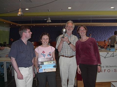 Ronald van Lent had de organisatie weer prima in orde. Helaas waren er toch weer enkele teams afgehaakt. De promotie voor het volgende NK zal dan ook wat grootser worden opgezet. Voor wat betreft het EK. Er wordt nu gerekend op wat meer nationaliteiten: Oostenrijk, Zwitserland, Italië, Zweden en Frankrijk zullen mogelijk ook van de partij zijn, naast Duitsland, Engeland, Nederland, België en Tsjechië. Drie van de vier spellen zijn inmiddels bekend: Eiszeit (Alea), Netzwerk (Jumbo) en TombRaider (Identity Games). Het vierde spel is nog een verrassing. Netzwerk is een bewerking van Morisi (Cwali). Het spel is tijdelijk niet verkrijgbaar omdat de spelregels niet compleet waren. Geen beste beurt dus. Binnenkort moet dat gecorrigeerd zijn. TombRaider zal tijdens het EK tweemaal worden gespeeld. Je speelt samen met een teampartner tegen 2 spelers van een ander team. Je kunt dus gezamenlijk een strategie bepalen ! Een gokje voor het vierde spel: Paris Paris ?