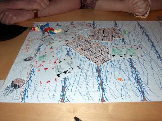 We kregen een groot spelbord, een stapel kaarten en enkele ruimteschepen in verschillende kleuren. De ruimteschepen bleken de pionnen te zijn en hadden niets met het thema te doen. Het grote spelbord zag er wat rommelig uit, maar was wel kleurrijk. Enrico las de regels voor, terwijl ik het spelmateriaal overeenkomstig verdeelde. De spelers kregen 3 pionnen die door het lopen over vlotten naar de overkant van het spelbord moesten komen. Op de vloten waren een soort doolhofjes getekend, waarmee de bewegingen werden geblokkeerd. Iedereen kreeg 5 kaarten, waarop telkens een waarde van 1 tot 3 stond en soms een speciale actie. De waarde was het aantal bewegingspunten. Je moest kiezen of je de bewegingspunten gebruikte of de speciale actie. Met de bewegingspunten kon je pionnen bewegen of vlotten waarop al een pion van je stond. De speciale acties bleken soms waardeloos en onduidelijk, andere waren weer veel te sterk. Zo konden alle pionnen van een vlot weer naar het begin worden gestuurd. Het spel was niet vooruit te branden en als er al iemand op het tweede vlot kwam, dan werd deze er weer net zo hard vanaf geschoten. Tijdens het spel bleek Iris een kaart te hebben waarmee een pion naar de finish kon worden gebracht. Het was meteen duidelijk dat je alleen kon winnen als je deze kaart twee keer zou krijgen. Later bleek dat we het bewegen helemaal verkeerd deden, waardoor het spel erg traag verliep. Maar zelfs met de juiste bewegingsmethode, zouden de speelkaarten het spel de grond in boren, helaas. Toch konden we op diverse punten nog redelijke voldoende geven. Er zou best wat van het spel te maken zijn, maar echt een topper was het niet.