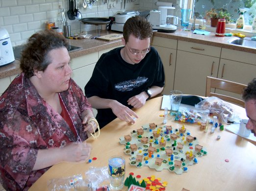 Inmiddels was het tijd voor het eindgesprek, waarbij beide teams bij elkaar zouden komen. Punt voor punt werden de spellen doorgenomen. Ook het andere team bleek nog enkele dingen verkeerd gespeeld te hebben, omdat we ze niet in de regels hadden gezet. De rest hadden ze goed geïnterpreteerd. Het grootste probleem dat ze met het spel hadden, was dat het dodelijk saai was. Door onze laatste aanpassingen, was het aantal beginblokjes te laag, waardoor het spel te traag op gang kwam. Tevens speelden ze met de kaarten dicht, waardoor er weinig concurrentie was. Ze hadden ook geen probleem met schaarse blokjes, waardoor het handelen tot bijna niets werd gereduceerd. Erg jammer, want we waren zelf best tevreden over ons resultaat. Uiteindelijk werd besloten dat beide spellen zo hun voor- en nadelen hadden en dat er geen duidelijke winnaar aan te wijzen was. Beide teams komen dus op de wisselbeker. Iedereen had er vrede mee en iedereen had zich prima vermaakt. Ook Armand had duidelijk schik in de manier waarop de teams hadden gewerkt. Wel vond iedereen dat de teams wat te groot waren, hoewel de verschillende inbreng van de diverse mensen verfrissend werkte. De tijd was erg kort om een spel goed te testen en vooral om de spelregels uit te werken. Volgende keer moet in ieder geval iemand van het team aanwezig zijn bij het uitleggen van het spel aan het andere team. Langzaam maar zeker ging iedereen naar huis, hoewel ook nog even op de Wegenwacht gewacht moest worden, omdat iemand zijn lichten aan had laten staan. Toen ik naar huis ging, was ook net de Wegenwacht gearriveerd. Nu maar hopen dat het probleem snel verholpen was.