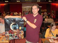 Michiel toont met trots de nieuwe tasjes van 999Games. |