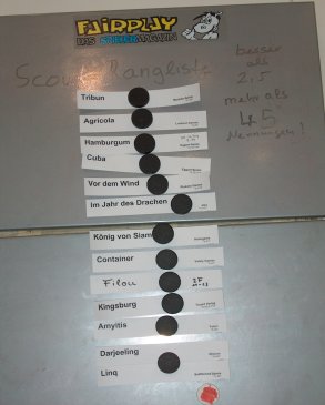 De uitgebreide lijst met 107 titels kun je vinden op de website van Fairplay Spielescouts. De verwachte titels zijn in de lijst te vinden. Tribun, Filou en Darjeeling waren bij mij van tevoren niet echt in beeld geweest. Kingsburg is me prima bevallen, maar was met € 40,00 best duur. Filou is een alleraardigst bied/kaartspelletje met leuke illustraties. Darjeeling zit leuk in elkaar, maar maakte bij mij niet echt enthousiasme los. De overige spellen heb ik nog niet gespeeld.