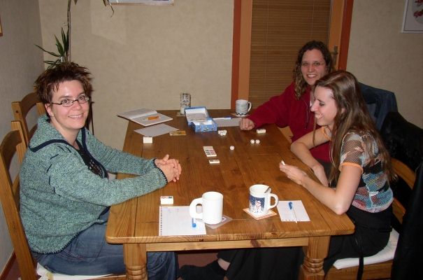 Daarna nog tijd voor een afsluitend spel. Ta Yü of Heckmeck. Na enig overleg werd besloten om nu te gaan HeckMecken en de volgende avond te starten met Ta Yü. Heckmeck, ook weer Knizia, is een heel erg leuk pestspelletje. Er liggen meerdere stenen met wormen van verschillende waardes op de grill. Men gooit alle dobbelstenen en als een soort Yahtzee kies je alle stenen van een bepaald getal. Met de overgebleven stenen gooi je verder, echter na deze worp mag je niet meer het getal selecteren dat reeds eerder gekozen is. Wanneer je de geselecteerde dobbelstenen bij elkaar optelt en dit is minimaal de waarde dat op een steen die op de grill ligt, dan mag je die nemen. Had je al een steen verworven dan plaats je de steen op de eerder verworven steen die hierdoor veilig ligt. Een worp moet wel minimaal 1 worm bevatten, de wormen staan op de dobbelsteen ipv de 6.Gooi je een waarde die overeenkomt met een getal dat een medespeler boven op zijn stapel heeft liggen, dan mag je de steen wegpakken. Lukt het je niet om een worp met een worm te produceren of je blijft steken onder het minimale getal dat op de stenen van de grill ligt of je gooit een worp met alleen maar getallen die al je eerder hebt geselecteerd, dan is je worp mislukt en leg je de bovenste steen van je stapel terug op de grill. Hierna wordt de steen met de op dat moment hoogste waarde op de grill omgedraaid en deze zal niet meer in het spel terugkomen. Aan het eind worden de wormen op de verworven stenen bij elkaar opgeteld en wie de meeste heeft wint. In dit geval wederom Esther.